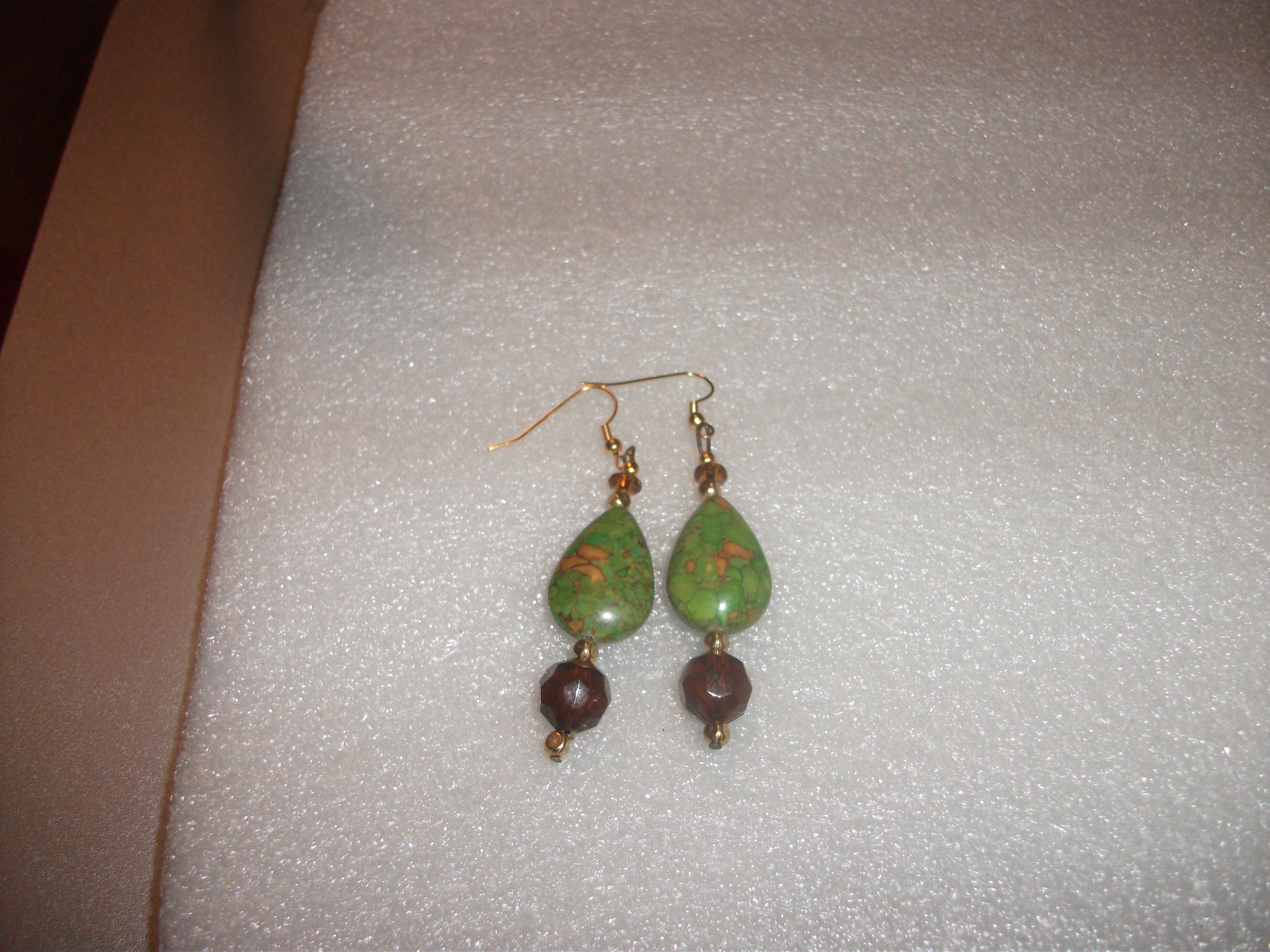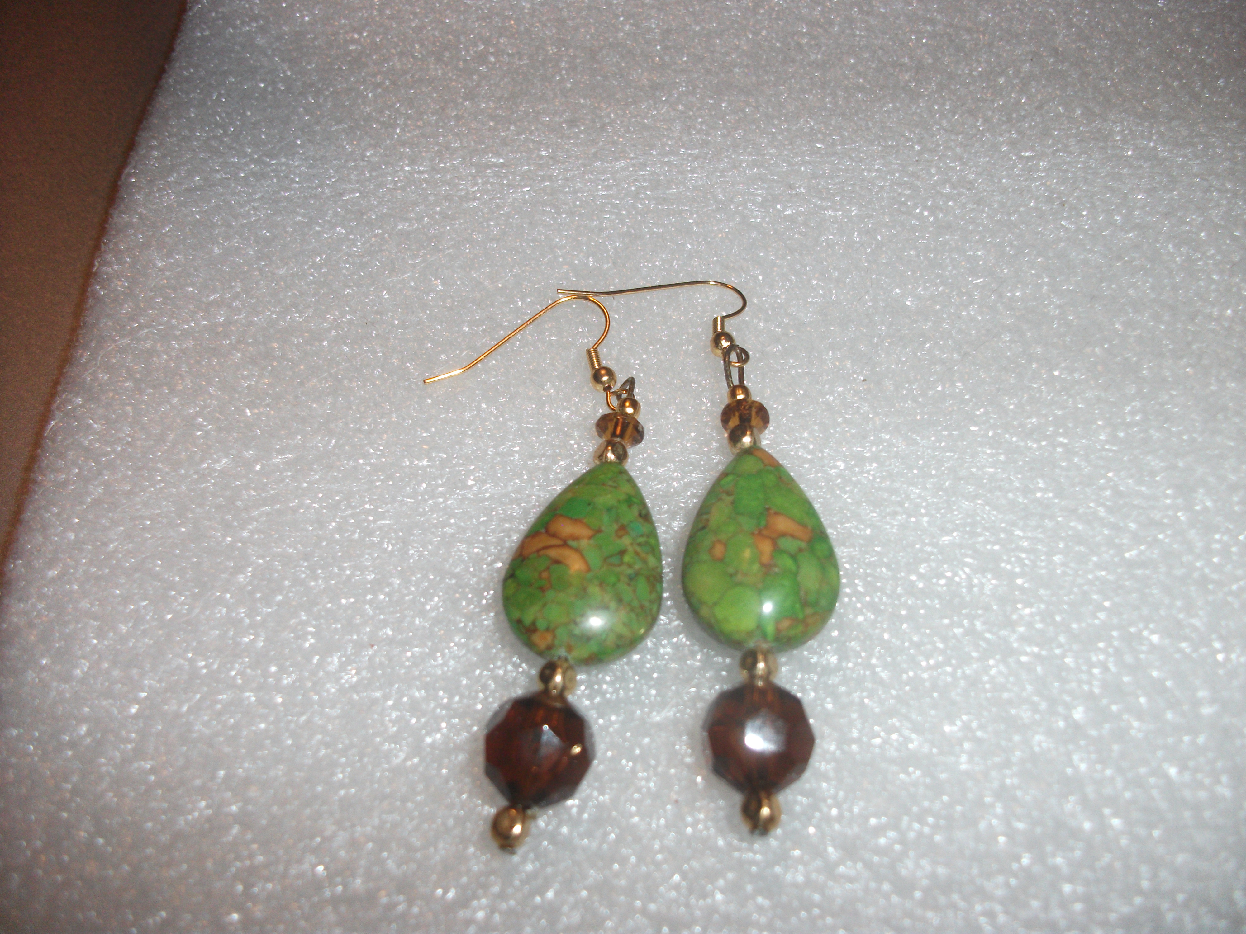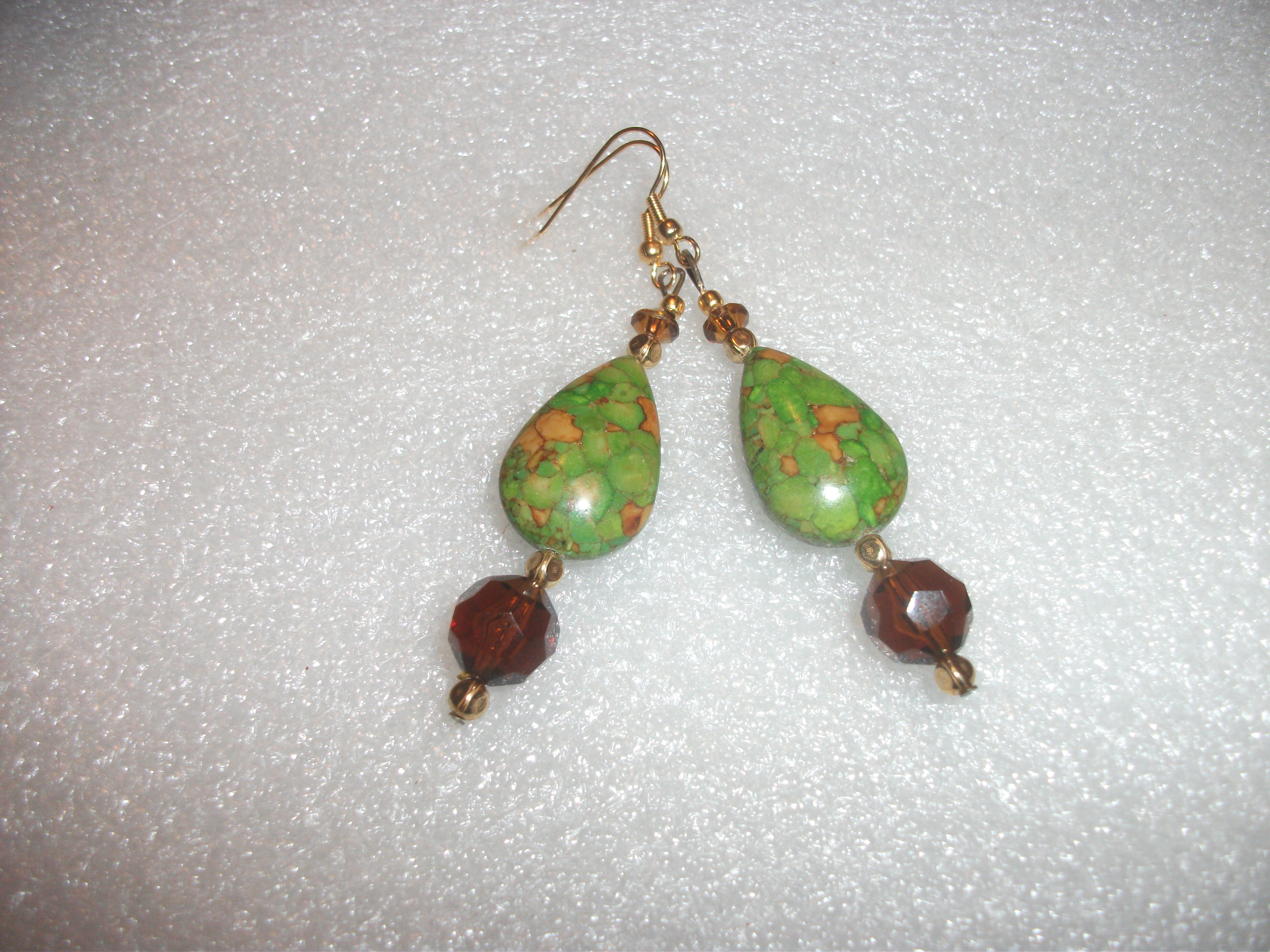 Real Mosaic Turquoise dyed green. Gorgeous teardrop stone earrings, accented with amber brown glass beads and small gold spacer beads. Enjoy this AMAZING value in price. The materials used to make this upscale pair are valuable! Treat yourself like the Queen you are!